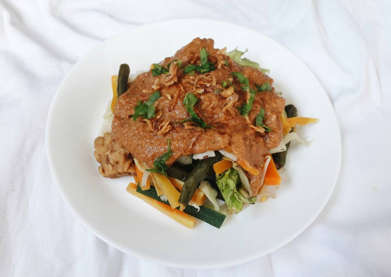 4. Kukus semua sayur kecuali sla dan mentimun. Susun sayur, tempe dan siram dg bumbu gado-gado. Gado-gado siap dinikmati.\"\"