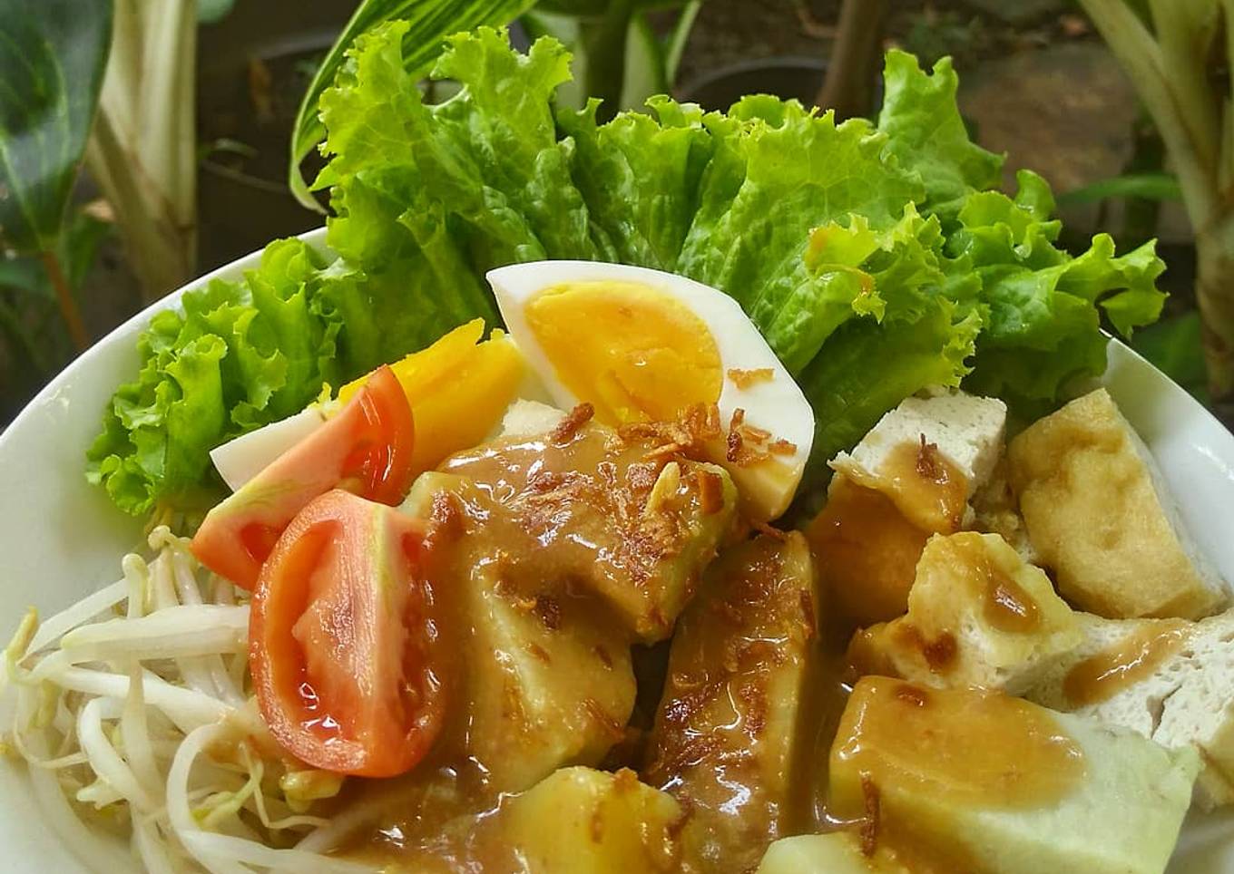 - Tata isian gado-gado, seperti lontong, selada, kentang, tomat, tauge, tahu goreng dan timun. Siram bumbu kacang.